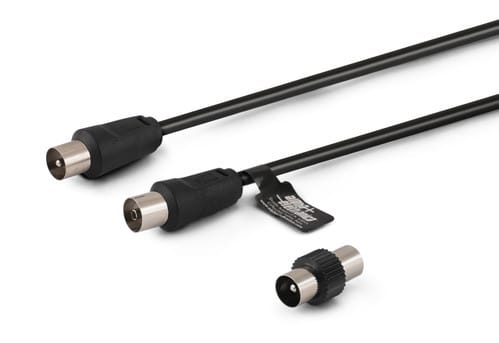 ** Caratteristiche **Colore cavo: NeroLunghezza Cavo: 2mDiametro cavo: ø5mmTipo Cavo: Lineare, TondoGuaina cavo: PVCSchermatura: Calza + foglioMateriale conduttori: Rame PuroCorpo connettori: PlasticoFinitura contatto : Nichelato** Connettore A **Tipo Connettore A: Spina TV Coax ø9.5mm** Connettore B **Tipo Connettore B: Presa TV Coax ø9.5mm