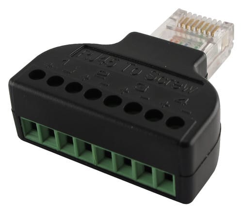 ** Caratteristiche Generali **Genere: SpinaColore: NeroTipo Connettore A: RJ45Genere A: SpinaTipo Connettore A: Spina RJ45Tipo Connettore B: Morsetto a viteTipo Connettore B: Morsetto a vite 8 poli** Caratteristiche Meccaniche **Materiale Corpo: PVCMateriale Contatto: Ottone nichelato