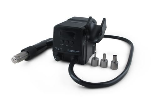 Stazione ad aria calda per saldatura e dissaldatura di componenti a montaggio superficiale SMD. La stazione è adatta per un utilizzo professionale e si rivolge a laboratori, centri assistenza e industrie nel campo dell'elettronica.La temperatura dell'aria è regolabile mentre il flusso si attiva automaticamente quando viene impugnata lo stilo dell'aria calda. Il display digitale permette la visualizzazione della temperatura.L'ampia potenza consente alla stazione di raggiungere velocemente la temperatura impostata e allo stesso tempo di mantenerla stabile.Inclusi nella confezione tre ugelli differenti per adattarsi al tipo di lavorazione da effettuare.** Caratteristiche Generali **Alimentazione: ElettricaPotenza: 300WTensione di funzionamento: 230VFrequenza: 50HzTemperatura: 100/500°CDimensioni: 155mm x 110mm x 125mmCapacità flusso aria min: 3L/minCapacità flusso aria max: 24L/minLa confezione contiene i seguenti ugelli:79-3913 (ø4,5mm)79-3912 (ø7,5mm)79-3911 (ø11,5mm)