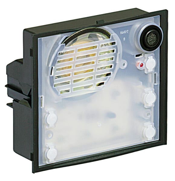 Modulo fonico analogico dotato di due pulsanti di chiamata e di un pulsante per il comando del relè luci scale. Cavi di collegamento a corredo.