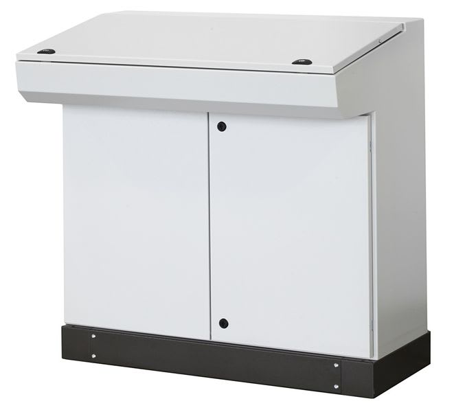 Leggio componibile modello LZ. Composto da corpo in lamiera pressopiegata e saldata sp. 15/10, porte in lamiera sp. 15/10, piastra interna in lamiera sp. 20/10 sendzimir, guarnizioni, poliuretaniche applicate in colata continua, cerniere reversibili con apertura 110°, serratura con impronta doppia aletta. verniciatura con polveri epossipoliestere termoindurenti in tinta RAL7035 bucciato, zoccolo RAL7022erniciatura con polveri epossipoliestere termoindurenti in tinta RAL7035 bucciato, zoccolo RAL7022. Grado di protezione IP 55 - TYPE 12.