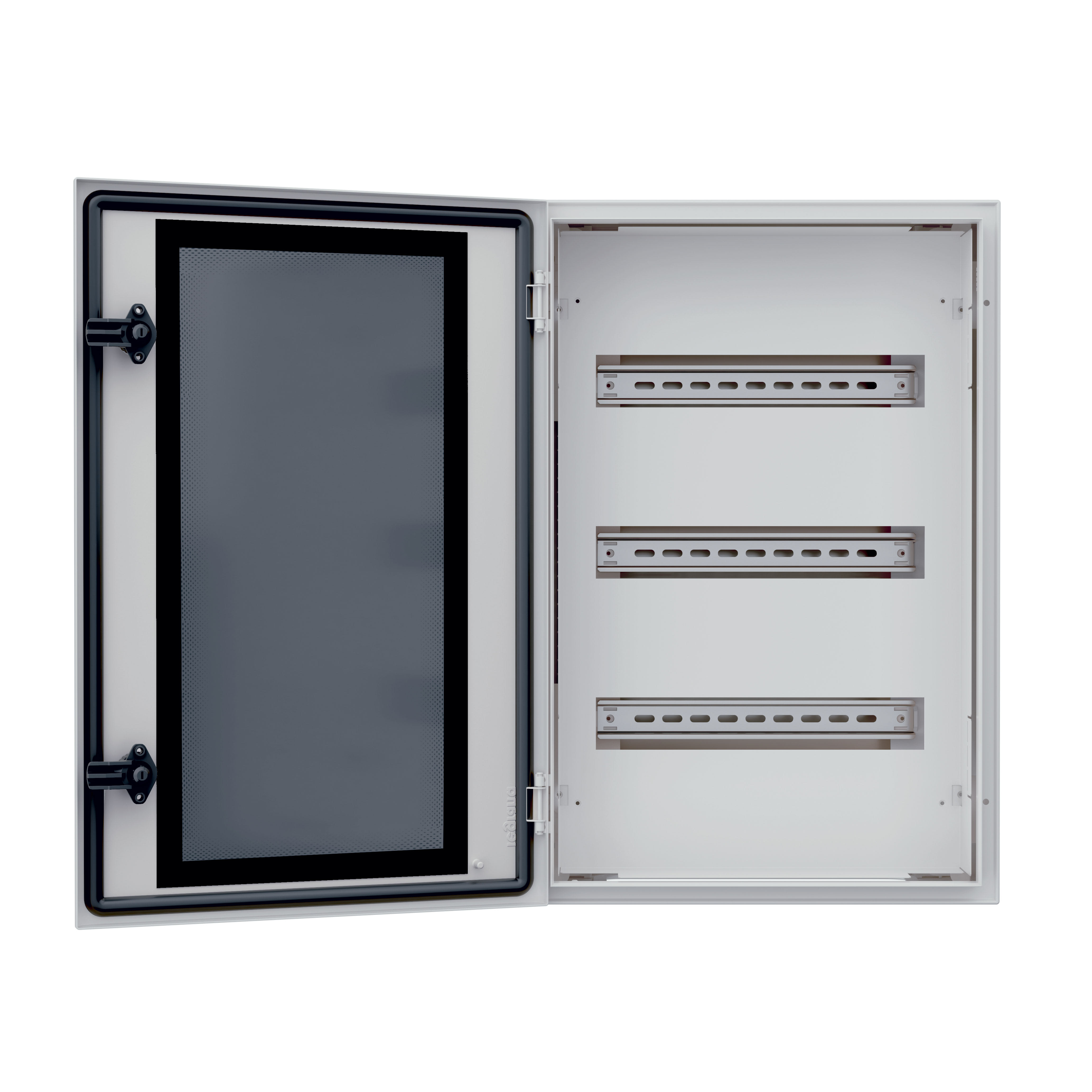 Telaio modulare in metallo per quadri 400 x 300 x 200 mm (3x10 moduli DIN). Kit completo fornito con montanti e pannelli finestrati. Fornito con 1 otturatore. Per quadri Atlantic-E, Atlantic inox e Marina