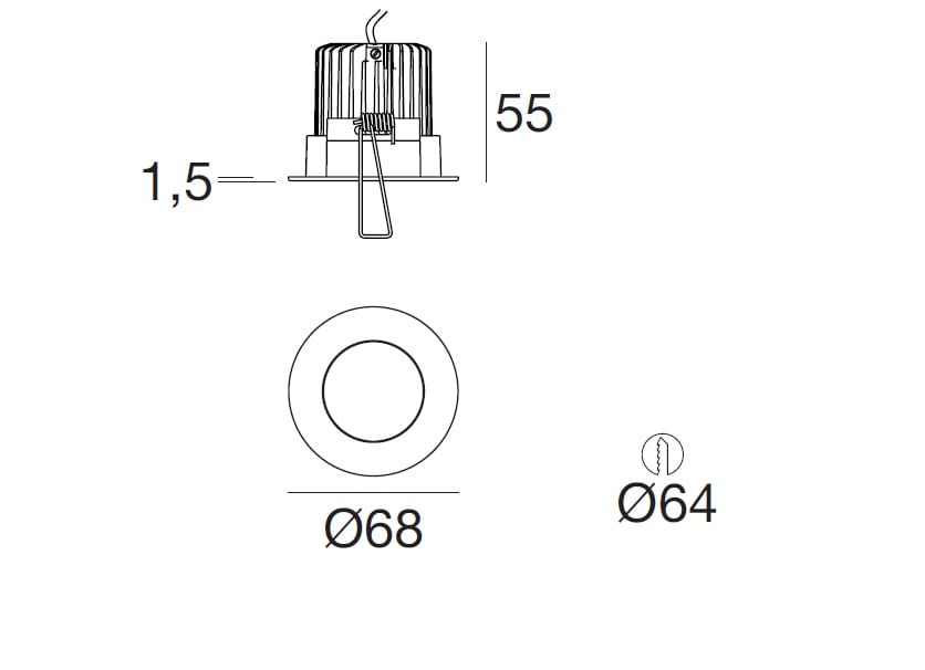 L'apparecchio presenta una classe di isolamento III ed è installabile a soffitto, con foro tondo di diametro 64 mm (nel cartongesso).