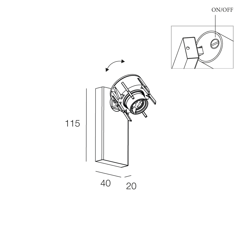 HONEY PR: Applique con spot orientabile in acciaio verniciato texturizzato bianco o nero oppure in ottone massiccio satinato, combinabile con basetta rettangolare da parete con portalampada, provvista di interruttore.