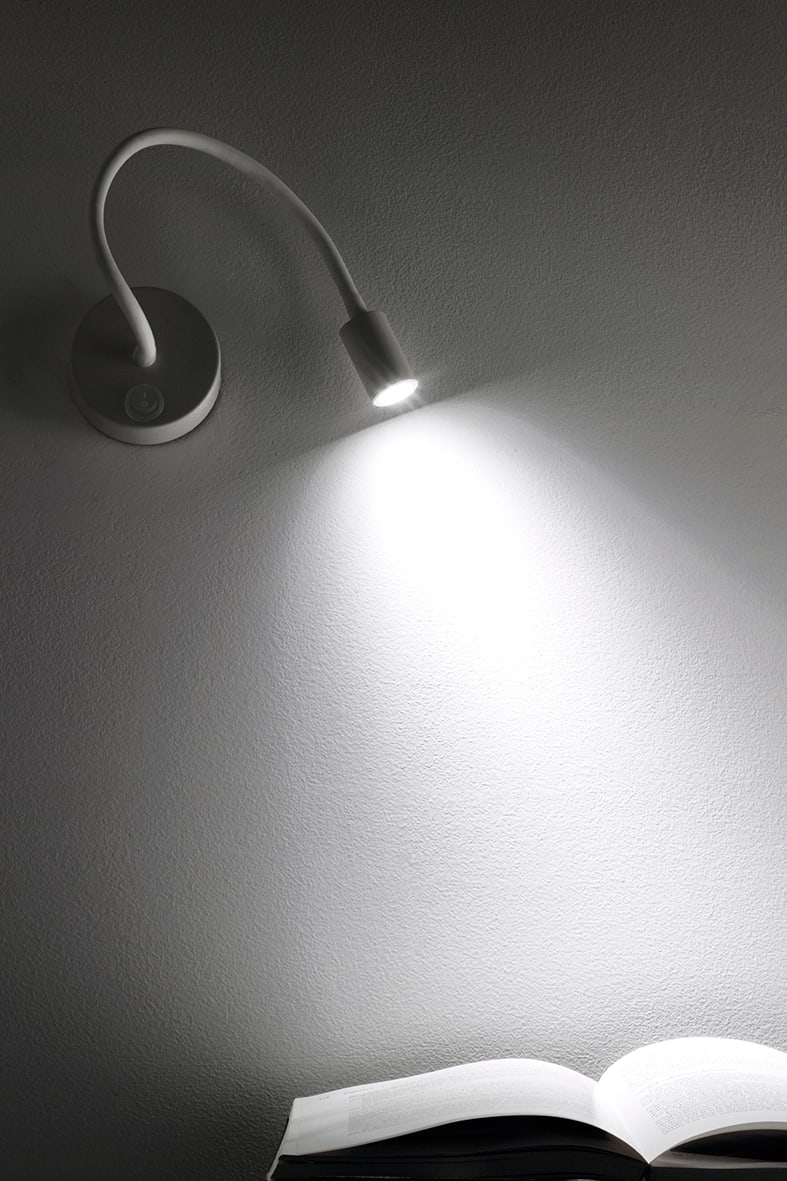 Lampada da lettura orientabile a LED (3000K), proposta nella versione a parete, da tavolo con base da appoggio o con comoda pinza che permette di posizionare la lampada su mensole, ripiani o scaffali. La versione a parete ? proposta con attacco circolaresu cui ? posta l?accensione, o con corpo lampada orientabile e supporto rettangolare con attacco USB che consente la ricarica dei propri dispositivi digitali. Il braccio flessibile ? rivestito da una guaina restringente nera per le varianti colore, bianca per la versione bianca, orientabile e modellabile a piacimento. Fascio di luce concentrato che rende il prodotto adatto ad installazioni in camera da letto o nelle camere d?albergo. Disponibile in cinque finiture (bianco, nero, rosso, gial lo e oro satinato).