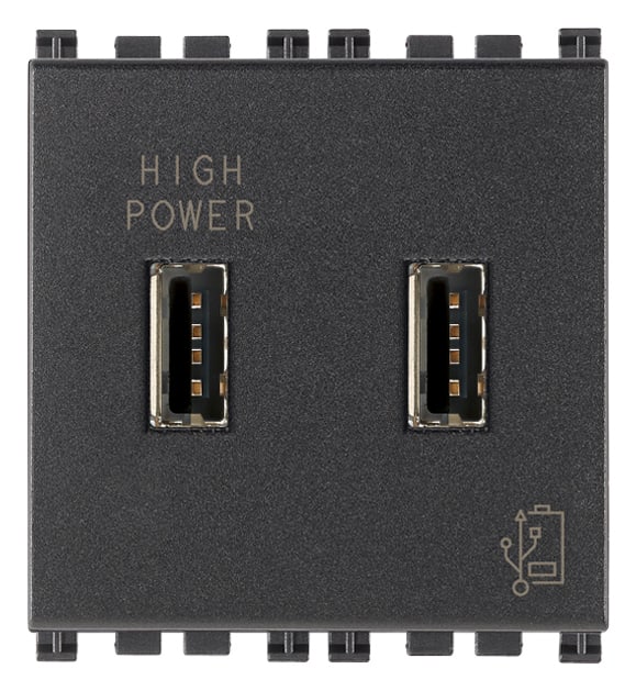 Unità di alimentazione 5 V 2,1 A per dispositivi elettronici, 2 uscite USB frontali, alimentazione 120-230 V~ 50/60 Hz - 2 moduli. Il dispositivo va utilizzato per ricaricare i telefoni cellulari e tutti gli apparecchi elettronici che offrono la possibilità di ricarica da una qualsiasi presa standard USB. Il dispositivo permette di ricaricare due apparecchi contemporaneamente.