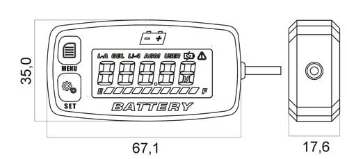 ** Caratteristiche **Indicatore di tensione con display LCD retro illuminato.** Dati tecnici **Tensione operativa: 12/24/36/48V** Parametri misurati: **Tensione: 12/24/36/48V con alimentazione da batteria** Display **Display LCD con retroillumninazioneCon indicazione numerica e con Bar-graph** Caratteristiche Generali **Grado Protezione: IP65** Caratteristiche Elettriche **Tensione d'ingresso: 12‑48Vdc** Caratteristiche Meccaniche **Dimensioni (LxWxH): 35 x 67.1 x 17.6mmMateriale contenitore: PlasticoColore: NeroConnessioni: fili liberi** Caratteristiche Termiche **Temperatura di lavoro: -10/40°C