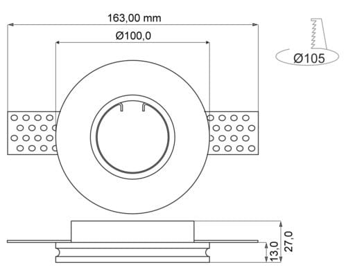 ** Caratteristiche Elettriche **Potenza max installabile: 35W** Caratteristiche Meccaniche **Altezza: 27mmDiametro: ø100mmForo incasso: ø105mmGrado di protezione: IP20Materiale corpo: GessoColore corpo: BiancoFinitura: OpacaDiffusore: NessunoOrientabile: noCover in vetro non prevista.Lampadina e portalampada non inclusi.Utilizzare esclusivamente i portalampade indicati:GU10 (230V): 23-9-104/3GU5.3 (12V): 23-9-106/3