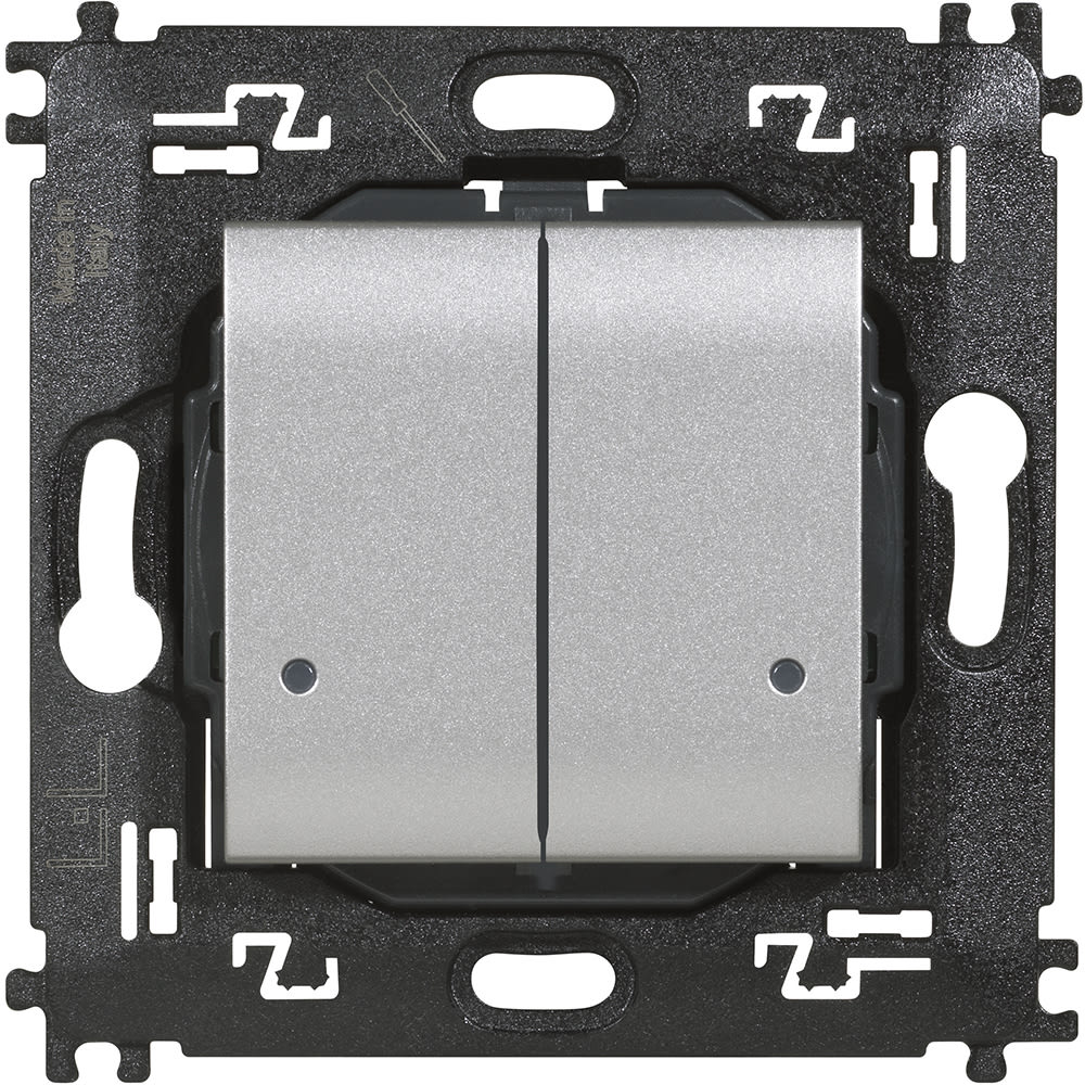 Comando doppio luci wireless dotato di due pulsanti per il controllo di due diversi dispositivi connessi per il comando di luci. Ogni singolo pulsante può essere associato ad uno o più dispositivi. Installazione superficiale con adesivi riposizionabili (forniti a corredo) o su scatole da incasso. LED integrato per la segnalazione batteria scarica. Alimentazione a batteria 3 V tipo CR2032 (fornita a corredo) con autonomia di 8 anni - 2 moduli.