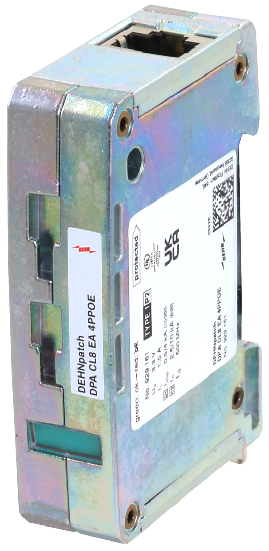 Scaricatore combinato universale salvaspazio con larghezza d?installazione di 19 mm e tecnologia di connessione RJ45 con indicatore di stato per una facile manutenzione. Protezione di applicazioni in cablaggi strutturati secondo la classe EA fino a 500 Mhz, ad es. pathcord per Ethernet, distributore di dati, sistemi di telecamere digitali a circuito chiuso, Power over Ethernet (IEEE 802.3 conforme fino a 4PPoE) e in generale interfacce basate su Ethernet. Protezione di tutti i doppini tramite potenti spinterometri a gas e diodi di protezione tra i conduttori di segnale e tra i doppini. Adattatore in versione completamente schermata con prese di collegamento RJ45 per il montaggio su montaggio su guida DIN. Con collegamento a vite aggiuntivo lato alloggiamento per un collegamento di terra ottimale.