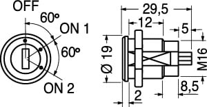 COMMUTATORE A CHIAVE MlNIATURA A 3 POSIZIONI PER ANTIFURTO. Estraibile sia in chiusura che in apertura del contatto. PORTATA MAX.:1 A-125 V. RESISTENZA ISOLAMENTO:200 M OHM. RESISTENZA CONTATTI:10mOHM max. ANGOLO ROTAZIONE:120°. TERMINALI:a saldare. CORPO E GHIERA: acciaio cromato.