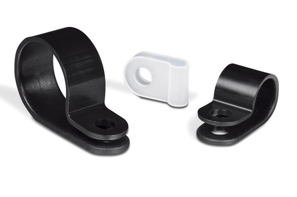P-Clip in poliammide. Buona resistenza alle alte temperature ed elevata resistenza meccanica. Sono diponibili in diverse misure per qualsiasi applicazione. Possono essere utilizzate senza fascette. Per fissaggi di cavi permanenti o semi-permanenti, questa gamma di P-Clip può essere utilizzata in molteplici settori. Il peso leggero la rende ideale all'utilizzo nel settore aeronautico e aerospaziale, dove è fondamentale minimizzare il peso e mantenere un fissaggio resistente.