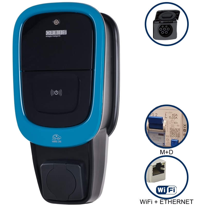 ORBIS - ORBOB94U1C09A2 VIARIS UNI+ BT2P74ETH MONOFASE 7.4 kW 32A, 1 PRESA TIPO 2 con SHUTTER, lettore carte RFID, WiFi + Ethernet - OB94U1C09A2