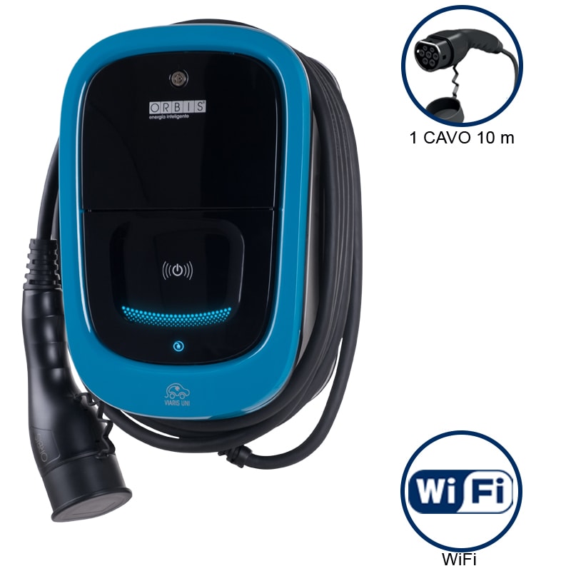ORBIS - ORBOB94U4A0HA1 VIARIS UNI+ C10T222 TRIFASE 22 kW 3x32A, 1 CAVO e CONNETTORE TIPO 2 lunghezza 10m, lettore carte RFID, WiFi - OB94U4A0HA1