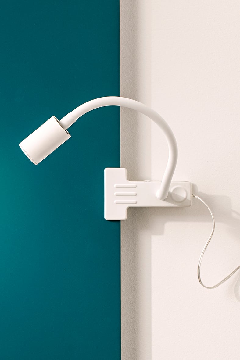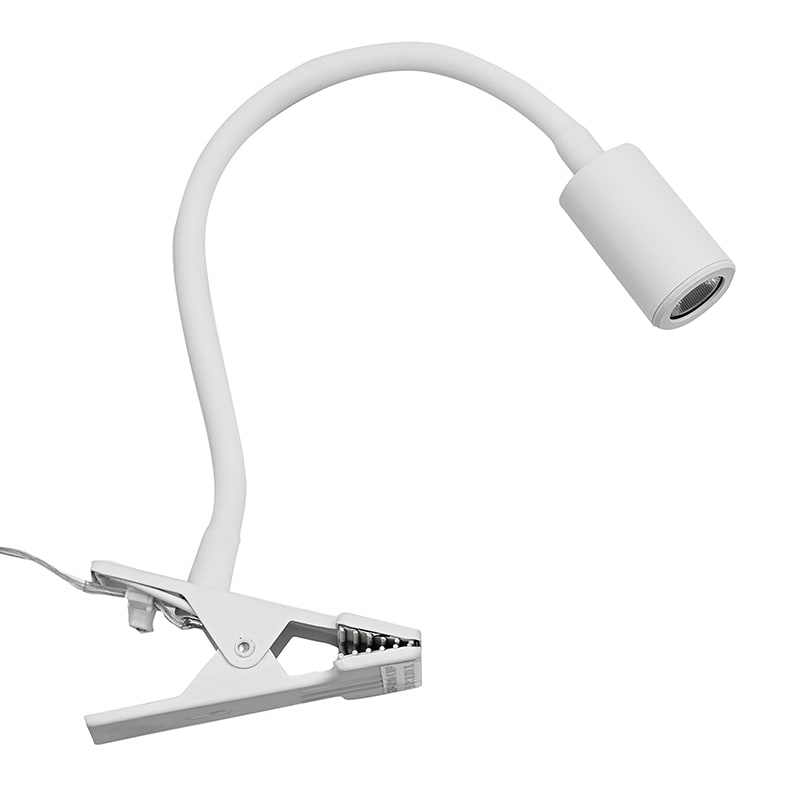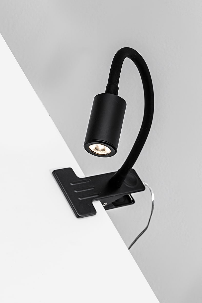 Lampada da lettura orientabile a LED (3000K), proposta nella versione a parete, da tavolo con base da appoggio o con comoda pinza che permette di posizionare la lampada su mensole, ripiani o scaffali. La versione a parete ? proposta con attacco circolaresu cui ? posta l?accensione, o con corpo lampada orientabile e supporto rettangolare con attacco USB che consente la ricarica dei propri dispositivi digitali. Il braccio flessibile ? rivestito da una guaina restringente nera per le varianti colore, bianca per la versione bianca, orientabile e modellabile a piacimento. Fascio di luce concentrato che rende il prodotto adatto ad installazioni in camera da letto o nelle camere d?albergo. Disponibile in cinque finiture (bianco, nero, rosso, gial lo e oro satinato).
