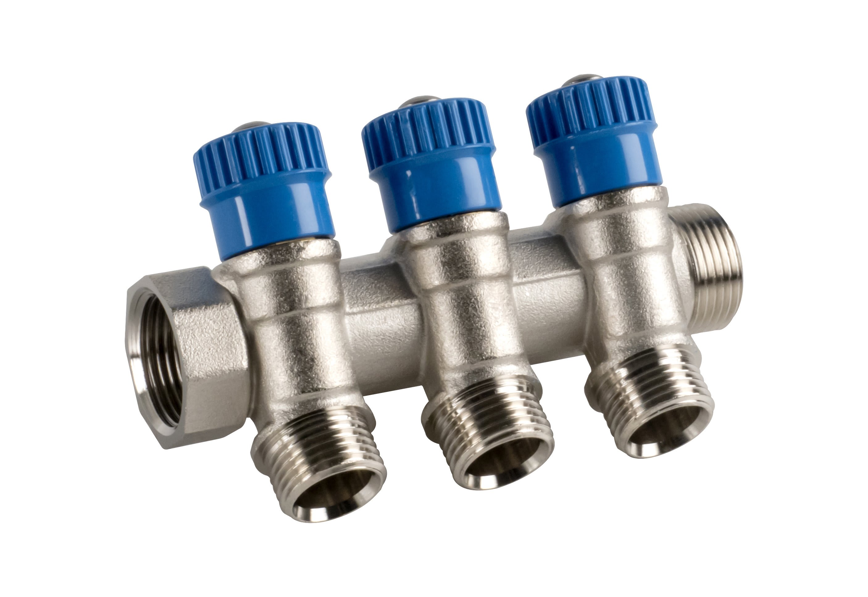 PEXAL BRASS COLLETTORE ø3/4"MF 3DERIVAZIONI ø1/2"M MANOPOLA ROSSO