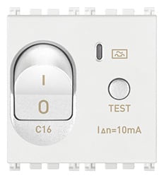 Interruttore automatico magnetotermico differenziale 1P+N C 16, alimentazione 120-230 V~ 50-60 Hz I∆n 10 mA, p.i. 3000 A - 2 moduli. Bianco.