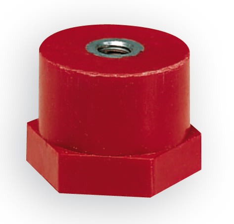 Isolatori adatti per essere impiegati come supporti o distanziali di parti elettricamente attive quali ad esempio le sbarre utilizzate nella realizzazione di quadri elettrici. Realizzati in resina poliestere con l'aggiunta di fibre di vetro garantiscono nel tempouna elevata resistenza meccanica ed elettrica, inoltre il materiale impiegato e del tipo antigroscopico e ad elevata autoestinguenza. Gli isolatori presentano su entrambi i lati di appoggio un'inserto filettato femmina in ottone o ferro zincato bianco che consente, tramite apposite viti di diverso tipo senza testa, l'accoppiamento con le parti interessate, mentre nella parte bassa è presente una fascia esagonale che ne consente il fissaggio.