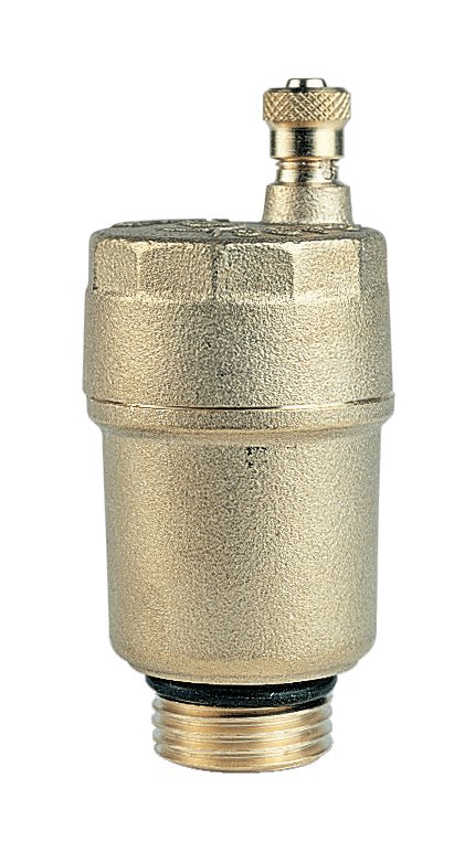 FLOATVENT. Valvola automatica sfogo aria verticale. Preguarnita O-ring. Adatta per installazione sugli attacchi di testa dei collettori complanari. Corpo in ottone CW617N. Pressione max. : 10 bar. Temperatura max. : 110 °C.